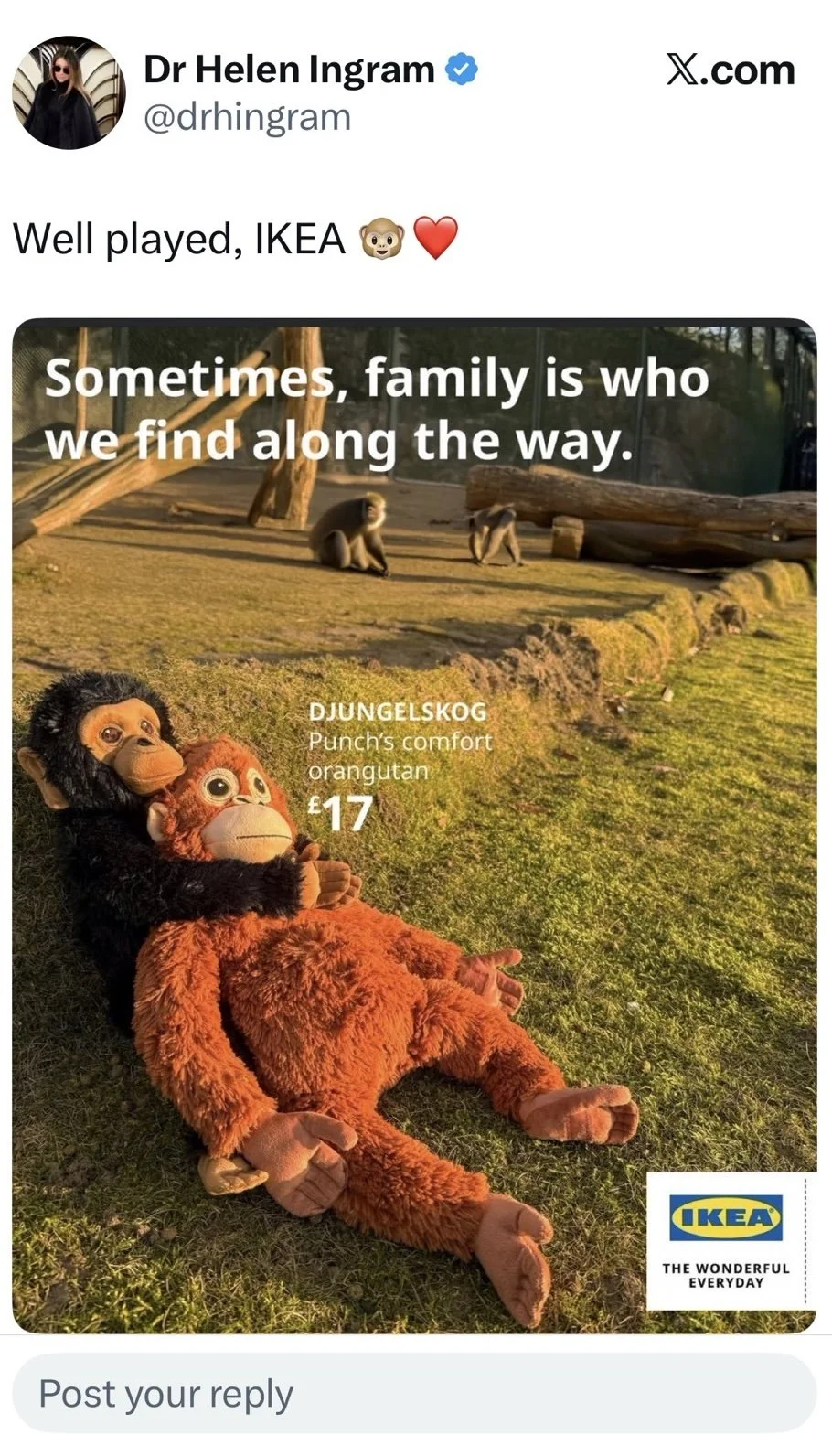 “I’m sure you’ve been following the drama of Punch the abandoned baby monkey over the last few weeks. My son fell in love with the stuffed orangutan so we did some online sleuthing and found it was from IKEA, of all places. Looks like IKEA has made the most of this moment 😊”