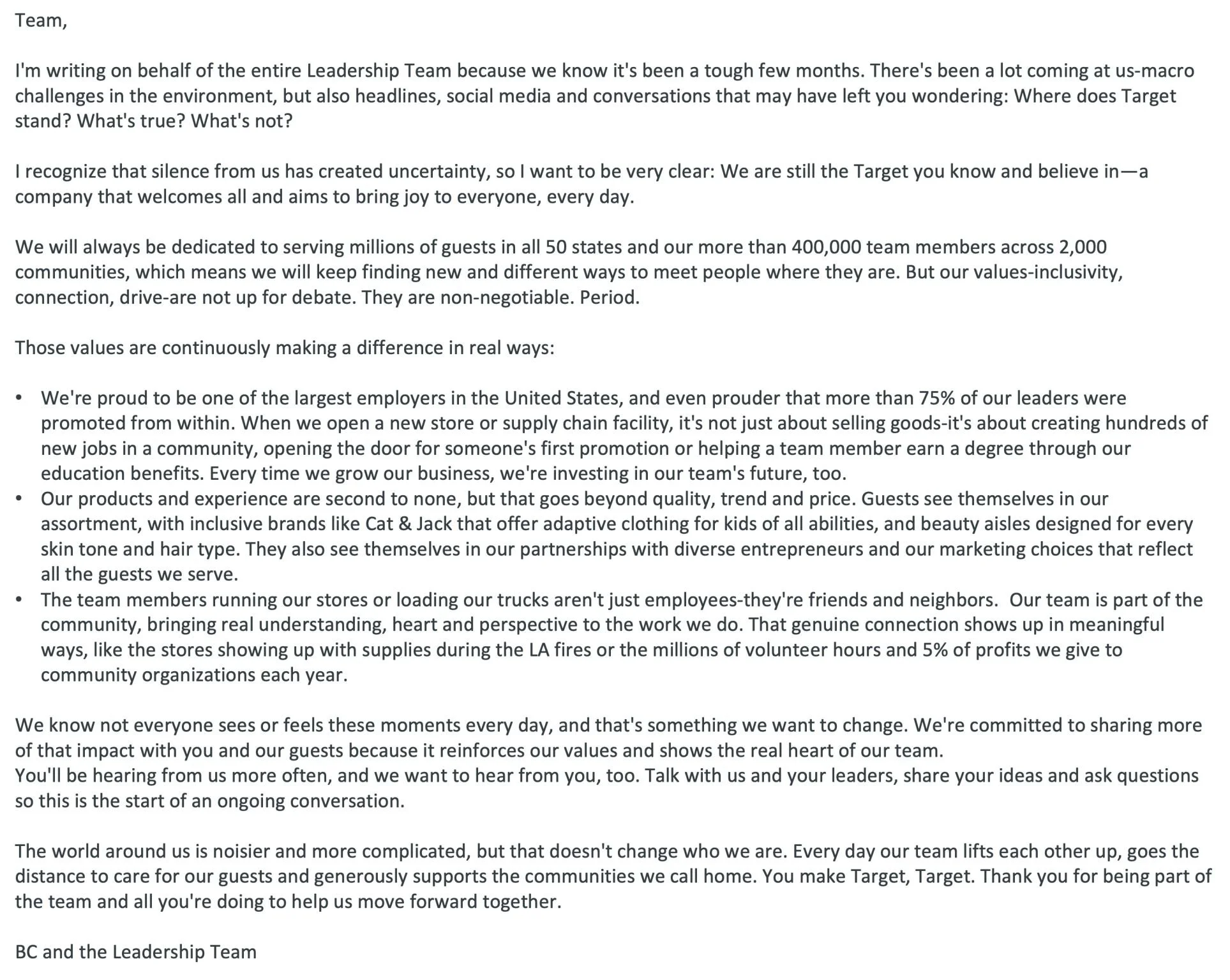 So it was a good thing when CEO Brian Cornell reached out with an all-staff email providing encouragement to the team after a long stretch of silence from the C-suite. Or was it? You can read the full email here.