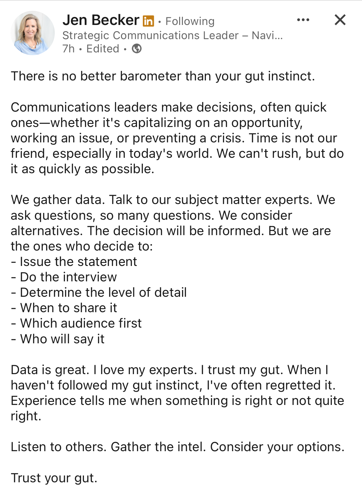 Great communicators bring experience and skill—but they also rely on strong instincts. We loved this perspective from Jen Becker.