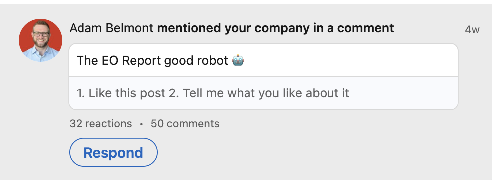 I’m grateful for the moment another newsletter on LinkedIn accused The EO Report of being a bot. Honestly, a milestone. You know you’re doing something right when someone thinks a robot is writing your work.